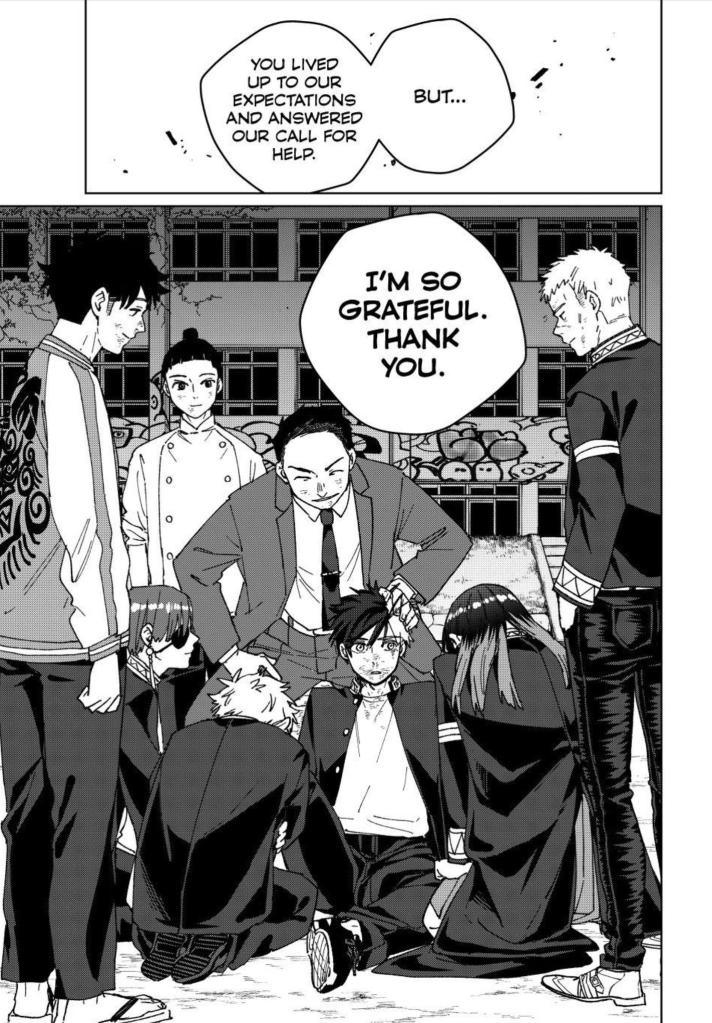 THE CHARACTERS! ARE ALL SO EMOTIONALLY MATURE! AND ELOQUENT ABOUT THEIR FEELINGS. THEIR THESIS AND PHILOSOPHY ABOUT THEIR STRENGTH! is so outwardly spoken about thing, but it never comes off as lecturing you, but as these recursive beliefs that characters have and do their best to expound on. And they convince each other, expand one another, need one another. The non-fantastical setting of windbreakers also heightens the immediacy of the thesis on violence.